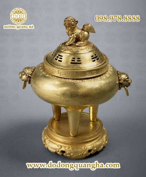 Các bảo vật trong cuốn sách Bảo vật hoàng cung triều Nguyễn được chia thành 4 nhóm: bảo vật tượng trưng quyền lực, đồ nghi lễ thờ cúng, văn phòng tứ bảo và đồ sinh hoạt. Nhóm bảo vật thuộc đồ thờ cúng bao gồm các loại đài thờ, mâm bồng, đỉnh trầm, chân nến, khay chén… Ngoài những ngày cúng lễ theo định lệ thì mỗi khi có việc trọng đại liên quan đến chính sự triều đình đều tổ chức các nghi lễ cáo yết tổ tiên rất trang trọng ở tất cả các điện thờ, miếu thờ. Trong ảnh là đỉnh thờ bằng vàng, dùng để đốt trầm trong các nghi lễ.